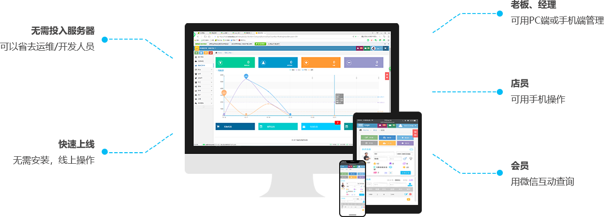 線下充值,線上消費(fèi)。線下積分,線上兌換。一個(gè)后臺(tái),總覽線上線下運(yùn)營情況。